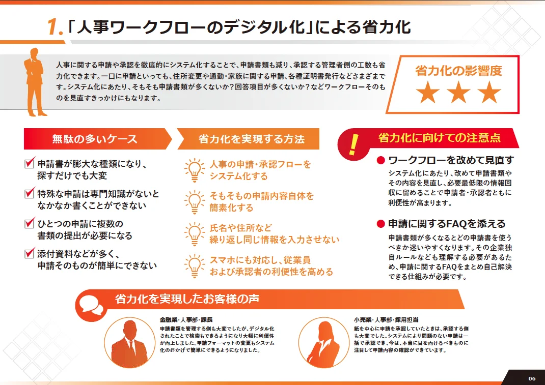 本資料では、人事部門を省力化する作戦を「定型業務の省力化」、「無駄な業務の廃止」、「企画・意思決定のスピード化」の3つのグループに分けて考え、自社の人事業務を棚卸し、それぞれの観点からできることはないか検討するための具体策をお伝えします。