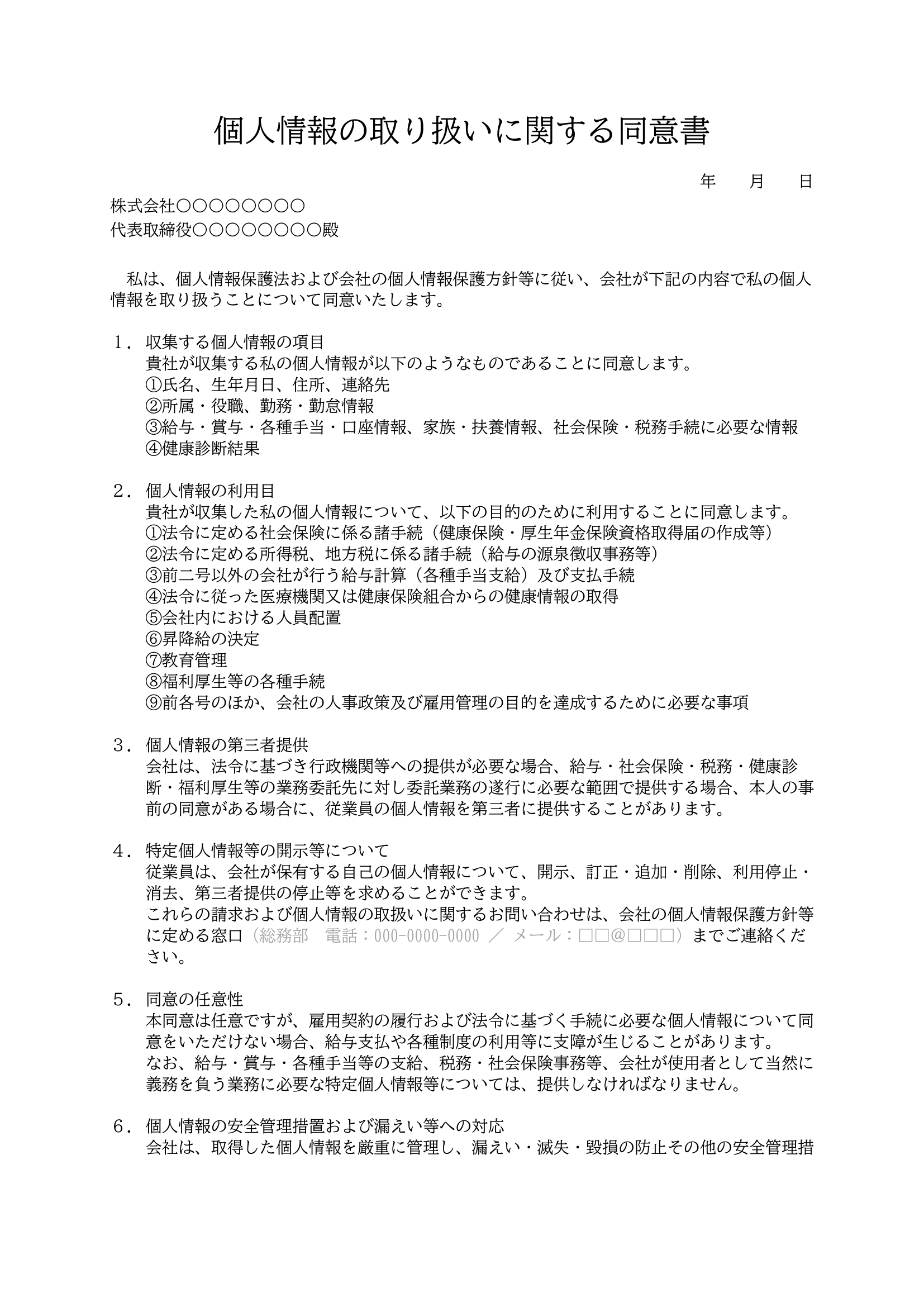 会社が従業員の氏名、住所、家族状況、給与口座などの個人情報を、雇用管理(給与計算、社会保険手続き等)の目的で取得・利用・保管することに、本人の承諾を得る書類のテンプレートです。